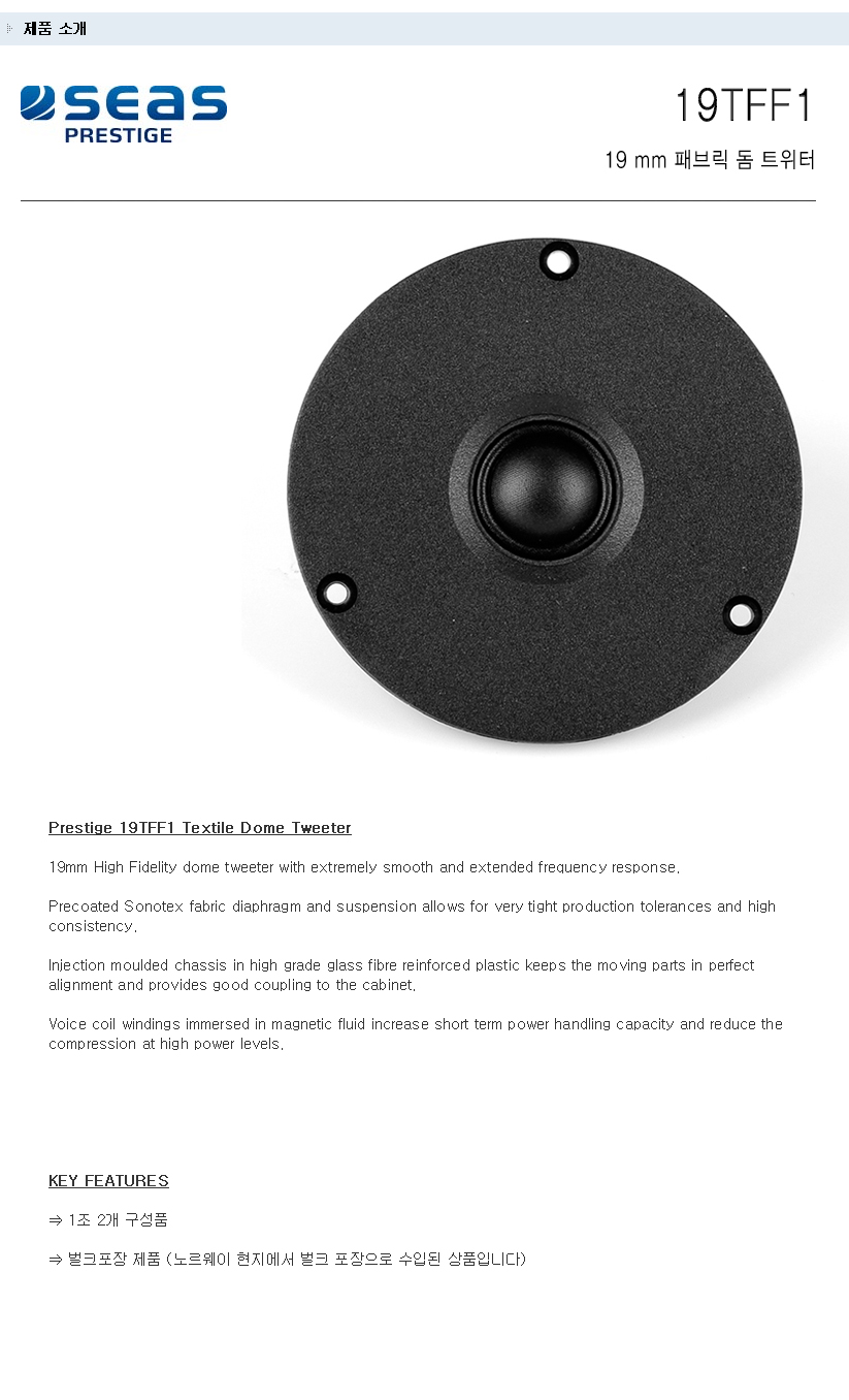 | 현재 위치 : Home > ▶ 스피커 유닛 (트위터 & 우퍼) > [SEAS - PRESTIGE 트위터] |